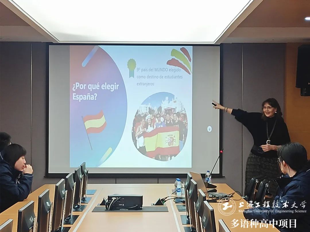 12月4日上午,西班牙公立卡斯蒂利亚拉曼查大学国际合作处主管及中国学生项目负责人Gloria Jordán Giménez女士来到上海工程大多语种高中项目,为西班牙语班学生做大学介绍并进行现场交流。