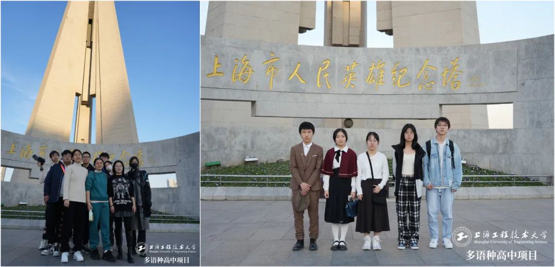 同学们按时在上海市人民英雄纪念塔前集合。三根拔地而起的擎天巨柱,宛若无言的丰碑,追念着由1840-1921年、1921-1949年以及1949年为上海解放而英勇献身的革命先驱。