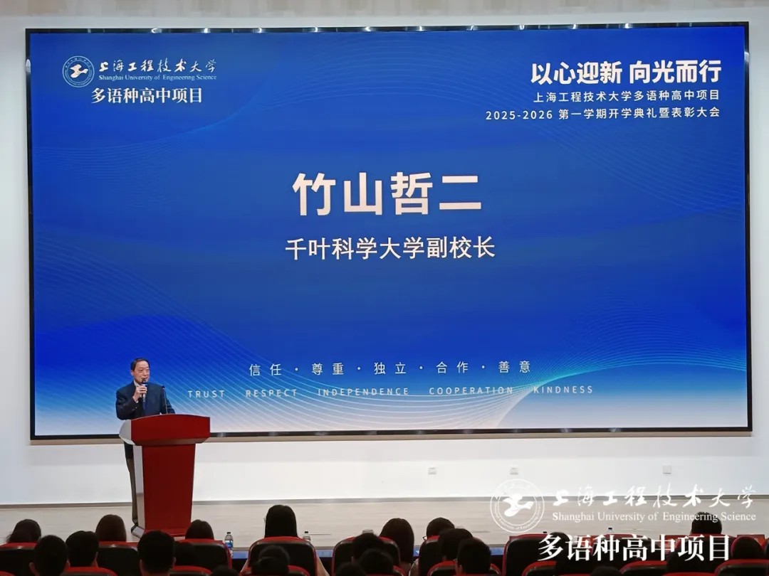 上海工程技术大学继续教育学院吴刚副院长、学院老师代表,及多语种高中项目全体师生近300人齐聚现场,共启新学年。本次活动还邀请了日本千叶科学大学副校长竹山哲二先生作为特别嘉宾到校出席。