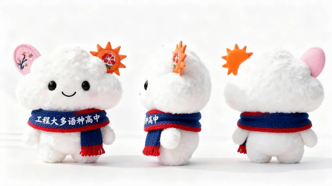 “云朵精灵”主体为圆润柔软的纯白色云朵造型,无棱角的设计赋予其温暖可拥的亲和力。其双耳采用渐变色彩设计:左耳为樱花粉,内绣樱花图案,代表日语;右耳为太阳橙,象征西班牙语。