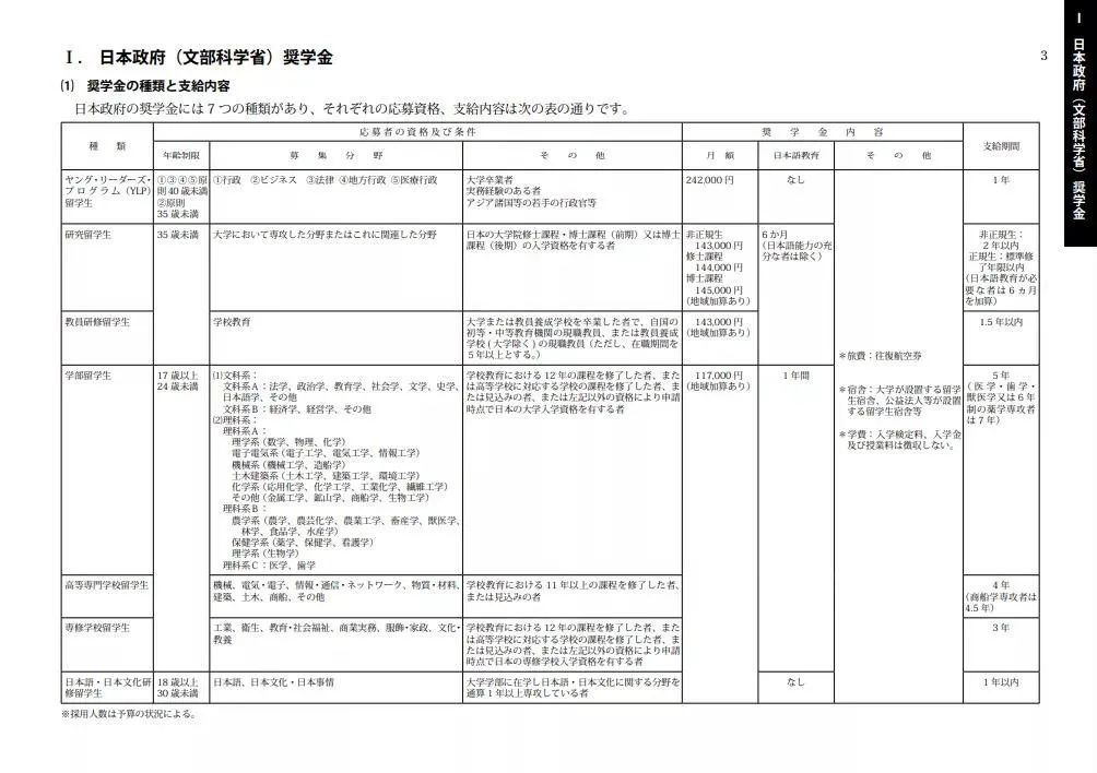 文部省奖学金共7种,对于年龄等分别有不同的要求,具体可参照下图: