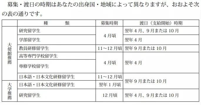 如果你是通过“大学推荐”的方式,那么需要注意的是不同项目的募集及渡日时间不同,如果想尝试申请文部省奖学金的同学一定要提前进行了解哦。具体可参照下表: