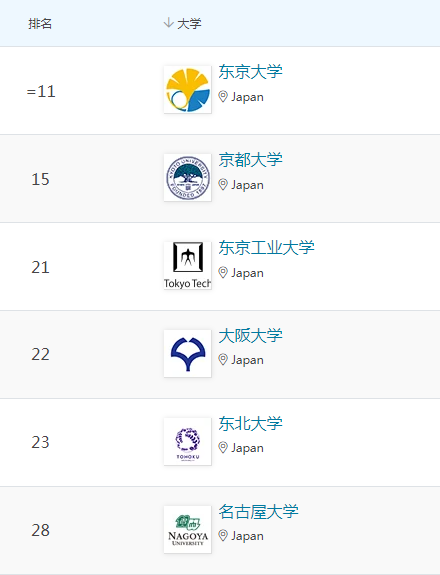 在本次的排名榜单中,日本共有108所高校上榜,其中有2所高校进入TOP20,进入TOP100的高校共有14所。