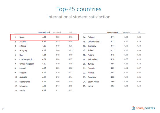 一项基于4,000所大学的108,000名学生的调查显示,西班牙大学的国际学生满意度在世界上名列前茅,此次排名NO.1!