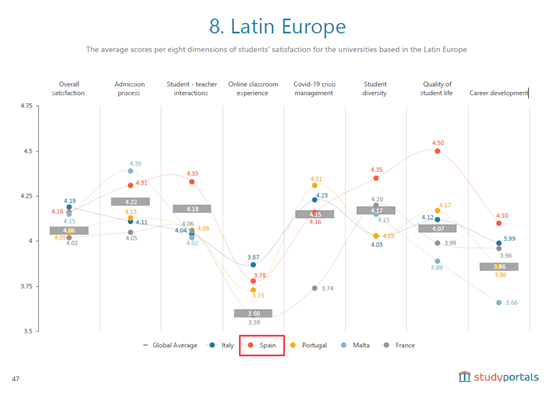 西班牙大学的国际学生在“学生生活质量”这一栏打上了高分——4.5,在“师生互动”及“学生多样性”方面,也打出了4.33、4.35的满意分数。