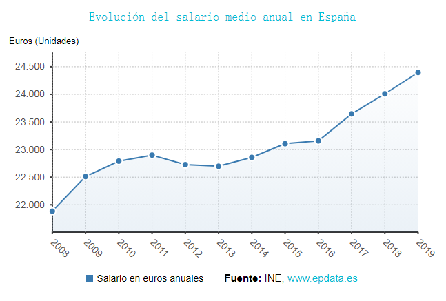 西班牙国家统计局Instituto Nacional de Estadística (INE)2021年6月发布了最新的西班牙薪资结构调查报告。报告显示,2019年西班牙平均年薪为24395欧元,比上年增长了 1,6%,连续六年持续增长,这无疑是经济危机以来最好的数字。其中年薪浮动最大的领域是房地产、教育以及通讯行业,上涨幅度分别为9.8%、9.4%、4.6%。