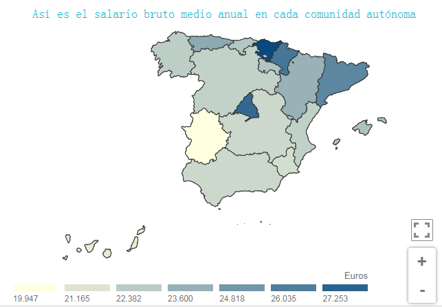 按大区分的话,2019年工资最高的是巴斯克地区,每位工作人员的平均年薪为29,476欧元,其次是马德里大区(27,817欧元)和纳瓦拉(27,493欧元)。加泰罗尼亚(25,968欧元)和阿斯图里亚斯(24,865.89欧元)也超过了全国平均水平。