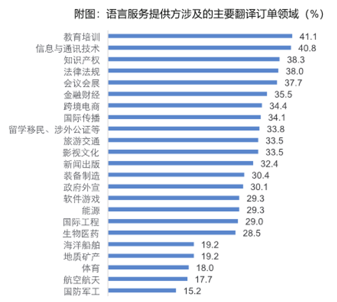 随着翻译领域和内容的日益多样化,翻译人才队伍发展对各领域起到了重要支撑作用。其中,教育培训、信息与通讯技术、知识产权是最主要的翻译业务领域,分别占了41.1%、40.8%、38.3%。