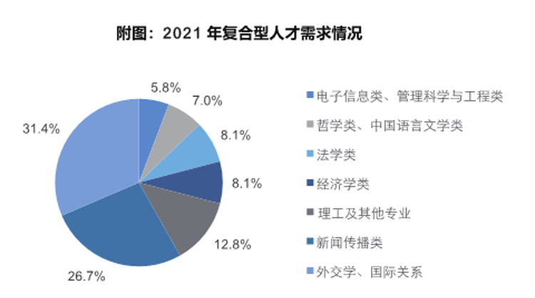 从近五年趋势来看,复合型人才需求占了多数,学科融合发展成为必然趋势,对掌握相关语种和其他专业知识的复合型人才的需求迫切。