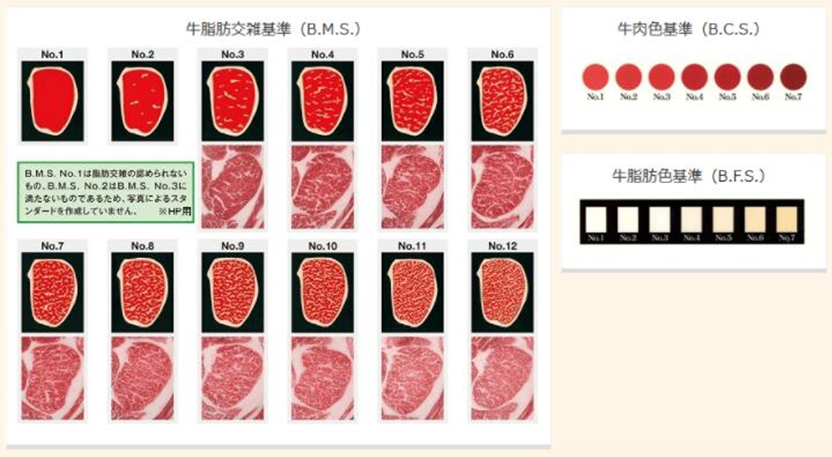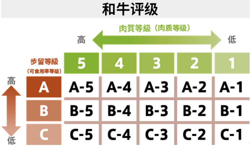 日本是对于牛肉等级分级最严格的国家,从和牛出生开始就需要登录血统证明、蹄纹、命名等身分证明,达重后会透过由日本食肉格付协会所制定的牛肉分类制度,做出评级:根据和牛步留等级(A、B、C)与肉质等级(1~5)两个辨别标准分出15个等级。