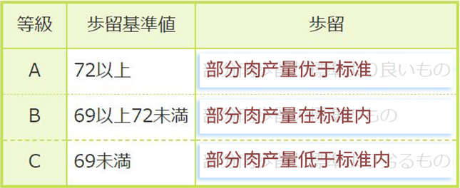 【歩留等级】由英文字ABC代表,含义是可食用率,按去除内脏、皮之后一整头牛可取得的食用肉比例多寡来分级,A为最多,C为最少。