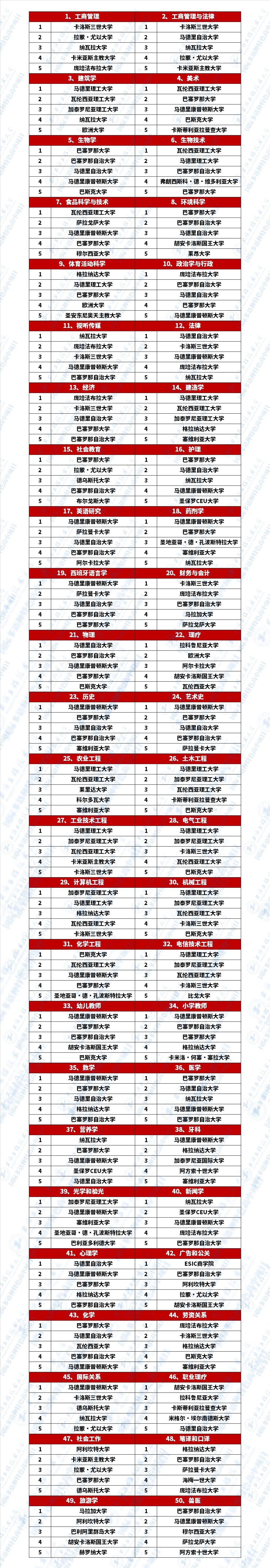 与此同时,《世界报》也评选出50个专业及每个专业前5的西班牙大学。我们已为大家进行了翻译整理: