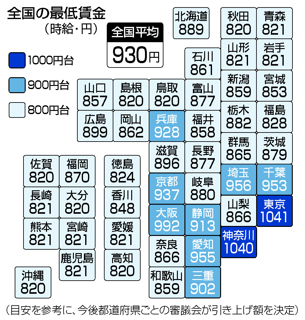 最低工资是适用于包括小时工等非正式劳动者在内所有劳动者的工资下限金额。目前,日本全国的平均时给工资为930日元。东京都(1041日元)和神奈川县(1040日元),这两个地方都超过1000日元,而最低的冲绳县只有820日元,800日元~900日元区间的据介绍占多数。