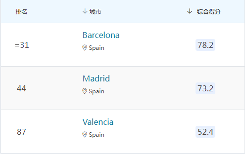 仅与中国一个大省人口相当的西班牙,此次最佳留学城市排名榜单表现稳定:巴塞罗那(31)成为西班牙最佳留学城市,马德里(44)和瓦伦西瓦(87)。