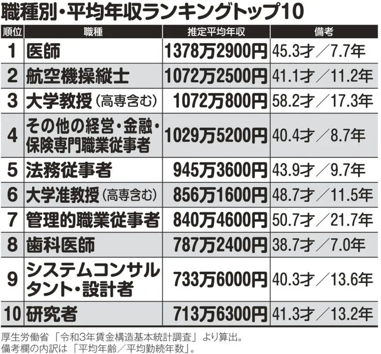 在公司职员的平均年薪低于500万日元的情况下,平均年薪超过1000万日元以上的高薪职业有4种,分别是「医生」「飞机驾驶员」「大学教授」「其他经营、金融、保险专业职业从事者」。