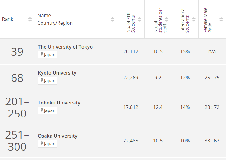 东京大学世界排名第39(去年排名第35)、京都大学排名第68(去年排名第61),排名皆有所下降。关于东京大学和京都大学排名下降,THE接受采访称,均因学习环境、大学出版物的学者引用次数等领域的评估下滑所致。