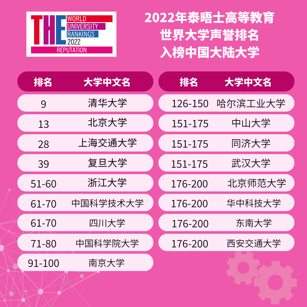 其中,亚洲的大学在2022年泰晤士高等教育世界大学声誉排名中全球认可度不断提高,中国大陆与日本引领亚洲大学排名。