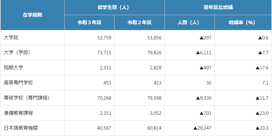 这份调查每年都会发布一次,统计对象包括大学(含大学院)、短期大学、高等专门学校,专修学校、为进入日本大学而设置的教育设施以及日语教育机关等的在籍外国人留学生。