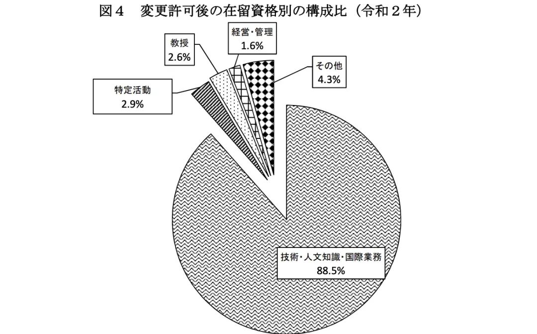 如图所示,有88.5%的留学生拿到了“技术人文知识和国际业务”签证,也就是我们常说的上班族。有2.6%的人拿到的是“教授”签证,1.6%的人拿到的是“经营管理”签证,也就是说自己在日创业,或者直接担任了其他公司的高级管理层职位。