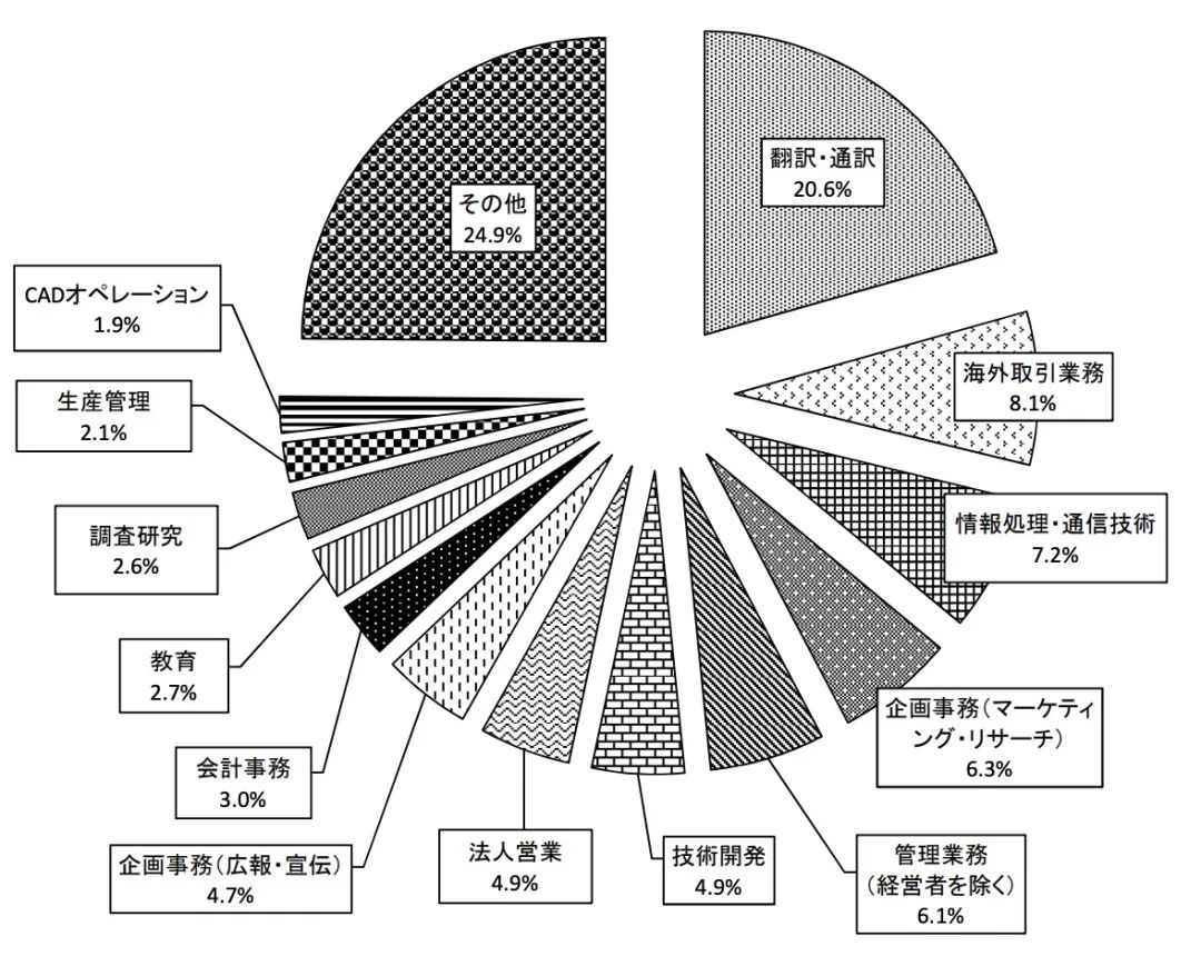 这些工作签证在申报时所填的具体从事的业务内容是什么?主要工作内容为翻译口译的占到了20.6%(一般不会只做翻译工作),人数为最多。其次是涉及海外国际业务的占8.1%,情报处理和通信技术(IT相关产业)的占7.2%。