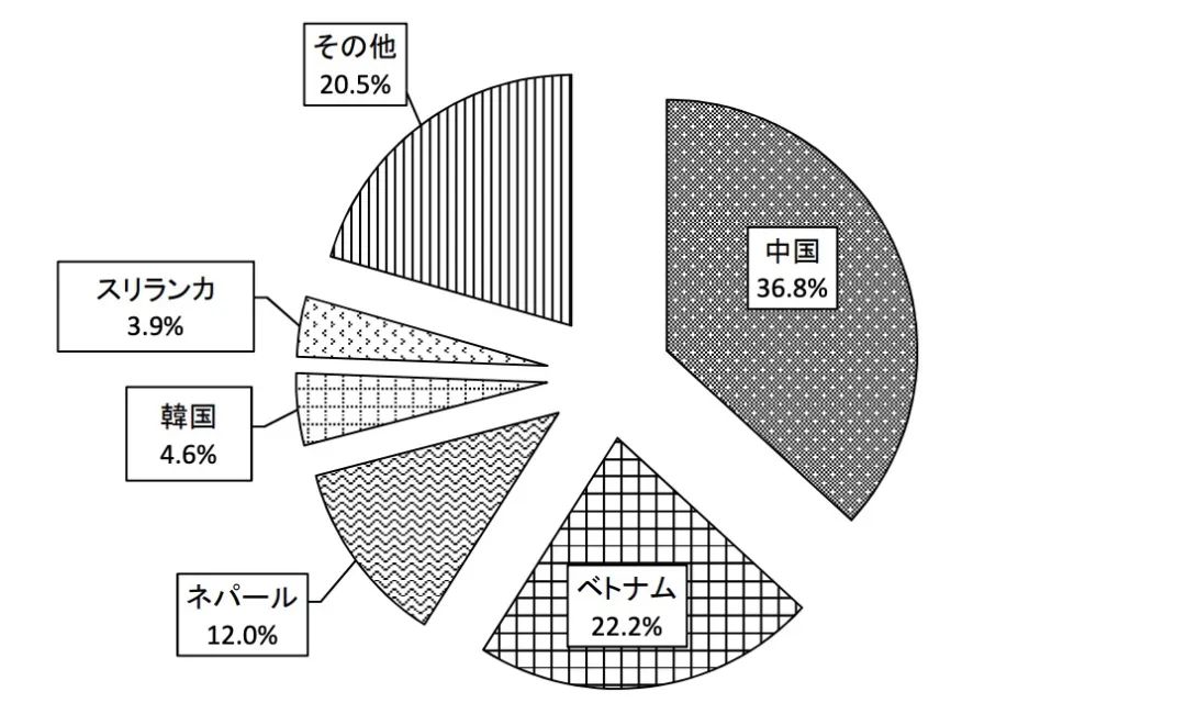 其次是越南,在日越南留学生人数为49469人,占总人数的20.4%;第三位是尼泊尔,人数为18825人,占总人数的7.8%;第四位是韩国,人数为14247人,占总人数的5.9%;第五位是来自印度尼西亚的留学生,人数为5792人,占总人数的2.4%。