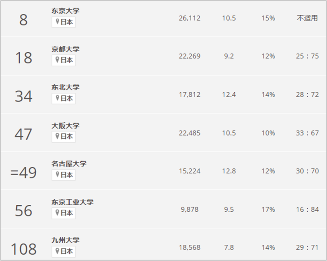 今年,日本院校除东大和京大外,进入前100排名的还有东北大学(34位)、大阪大学(47位)、名古屋大学(49位)、东京工业大学(56位)。
