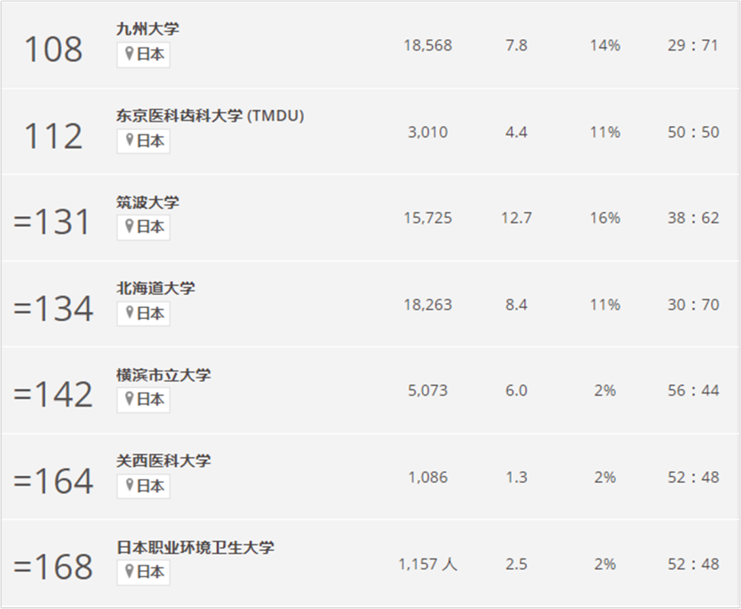 位列top200的大学有:九州大学、东京医科齿科大学 (TMDU)、筑波大学、北海道大学、横滨市立大学、关西医科大学、日本职业环境卫生大学。