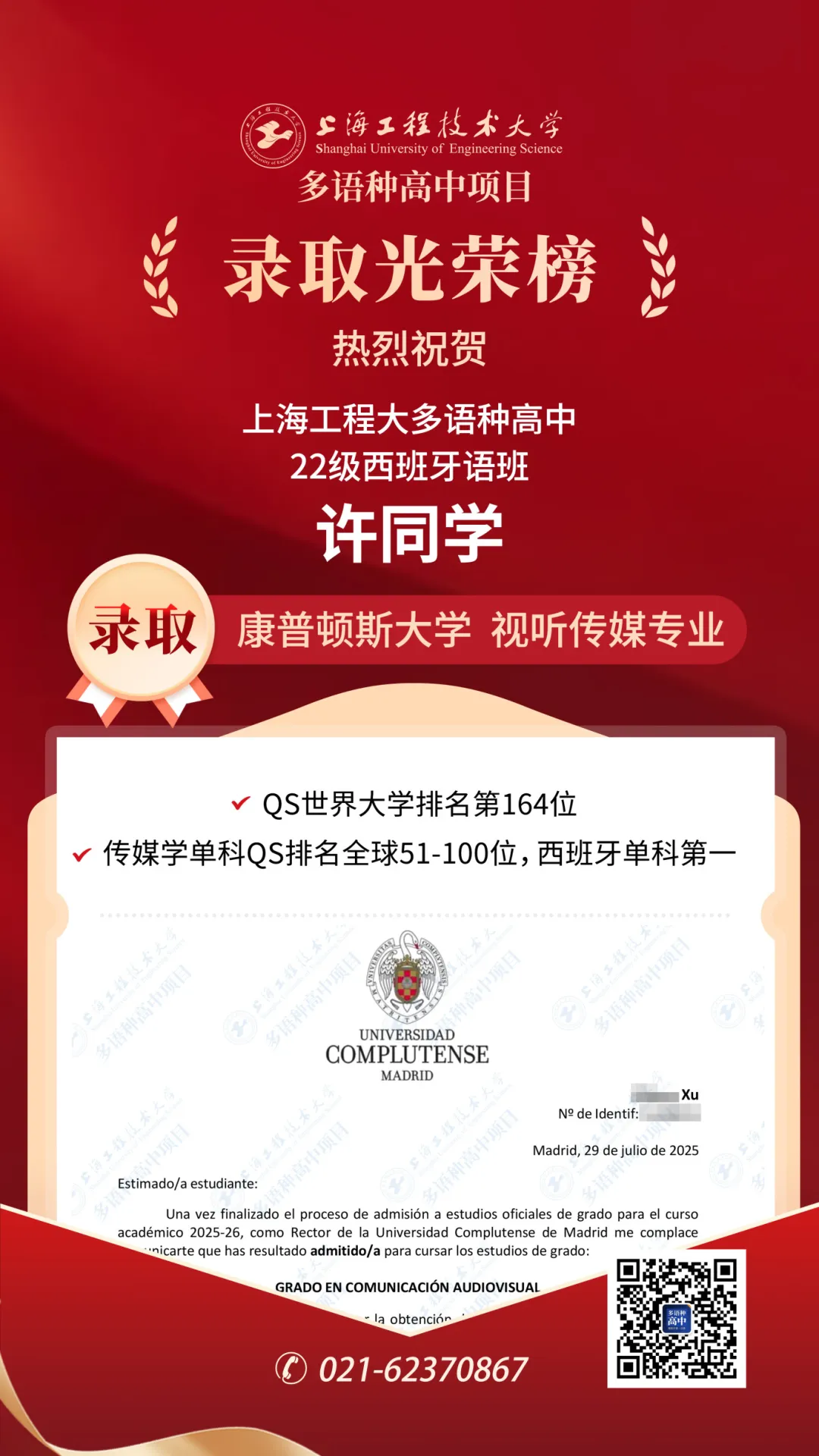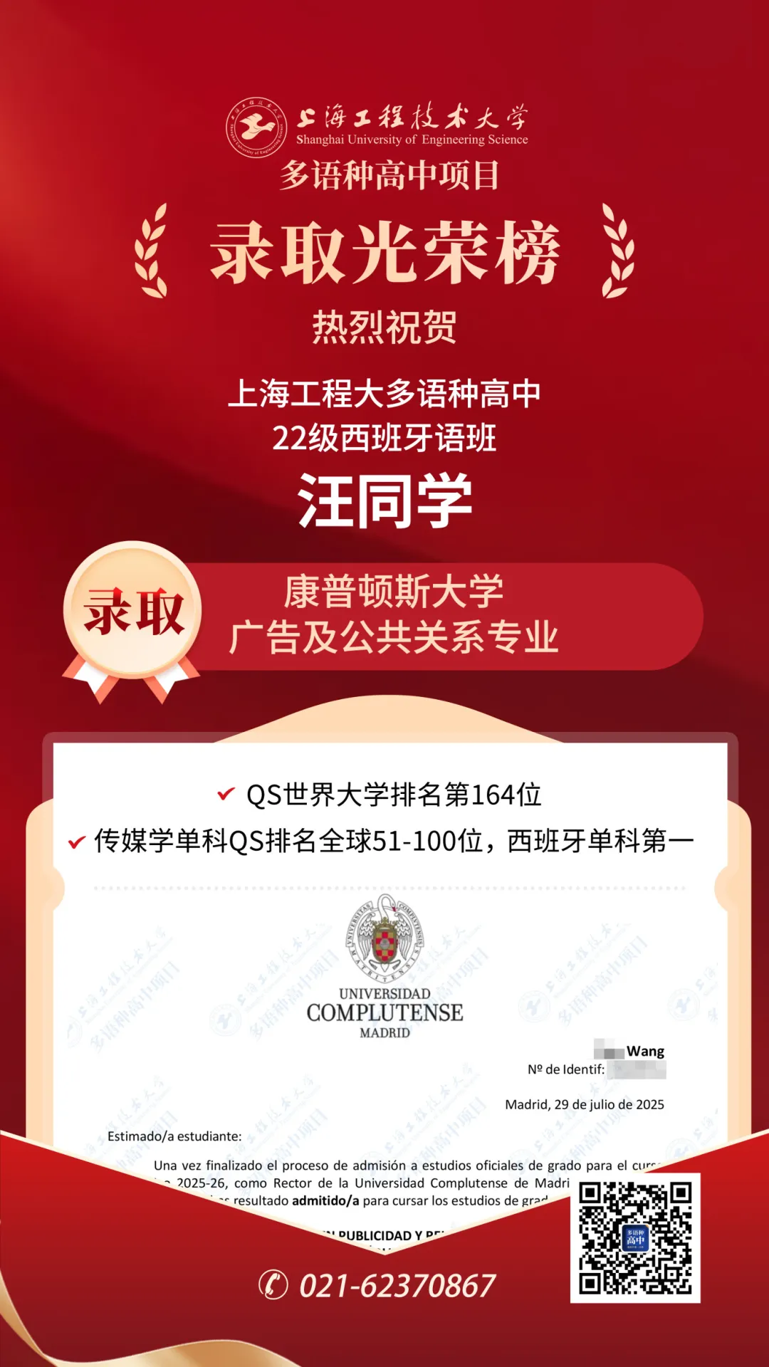 重磅喜讯! 上海工程大多语种高中22级西班牙语班捷报频传!汪同学与许同学凭借卓越的综合实力,双双斩获西班牙顶尖学府——马德里康普顿斯大学(Universidad Complutense de Madrid, UCM) 的热门专业录取!汪同学成功录取广告及公共关系专业;许同学则成功录取视听传媒专业,两位同学均荣获70%的高额奖学金。热烈祝贺两位同学!