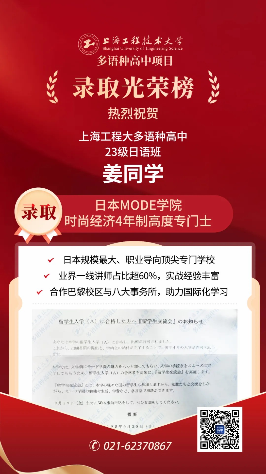近日,上海工程技术大学多语种高中喜迎佳音——姜戎天同学于高三上学期成功获得日本东京MODE学园时尚经济专业的录取通知,提前一年叩开了通往国际时尚产业的大门。