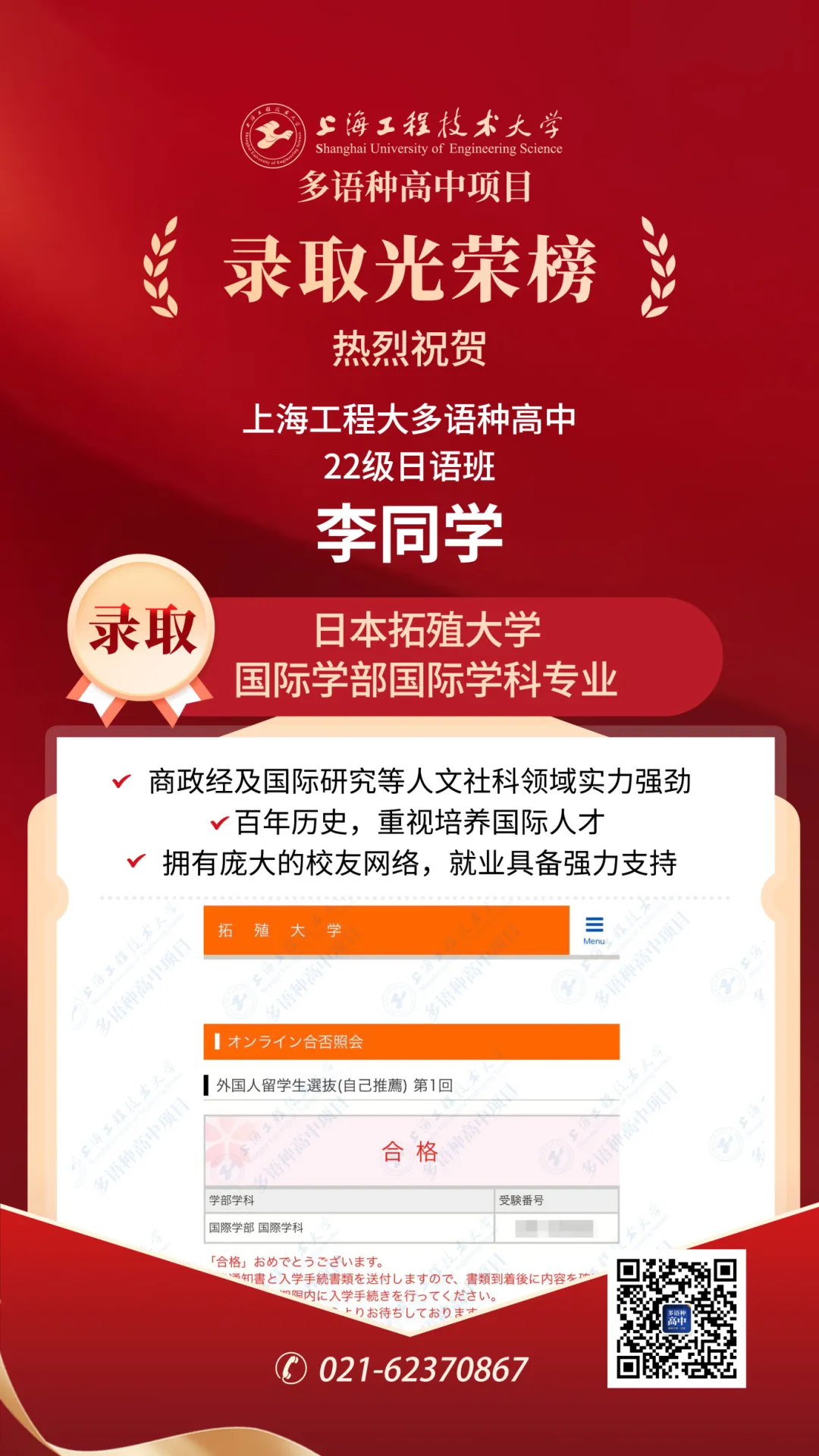 恭喜李同学录取日本拓殖大学国际学部国际学科专业